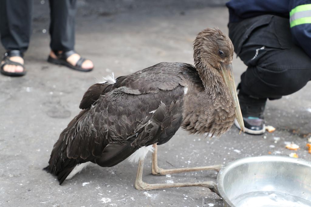 “多虧你們及時(shí)發(fā)現(xiàn)并救起它?!睋?jù)林業(yè)局工作人員介紹,黑鸛是一種性情機(jī)警的大型涉禽,正常情況下人無(wú)法近身,更不要說走到它身邊將其抱起,令人擔(dān)憂的是,這是一只幼鳥,而且在集裝箱幾天未能進(jìn)食,精神極度萎靡,需要馬上救治。林業(yè)局工作人員對(duì)于救助野生動(dòng)物的愛心行為表示感謝,隨即將黑鸛送往野生動(dòng)物救助站進(jìn)行救治。