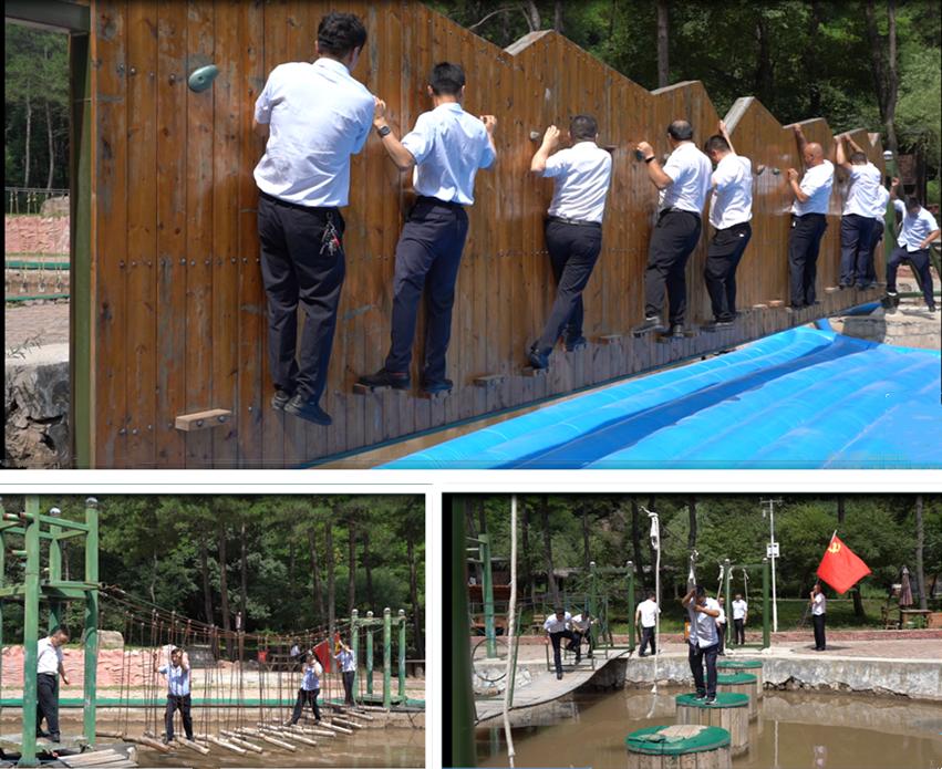 在參觀學(xué)習(xí)完小石崖、陜甘邊區(qū)南區(qū)革命根據(jù)地簡史展后,大家來到黃陵國家森林公園,開展戶外拓展訓(xùn)練,活動從體能訓(xùn)練兼娛樂的蹺板橋開始,依次進(jìn)行“水上漂、獨木橋、圓木橋、手吊環(huán)、單線橋”等。