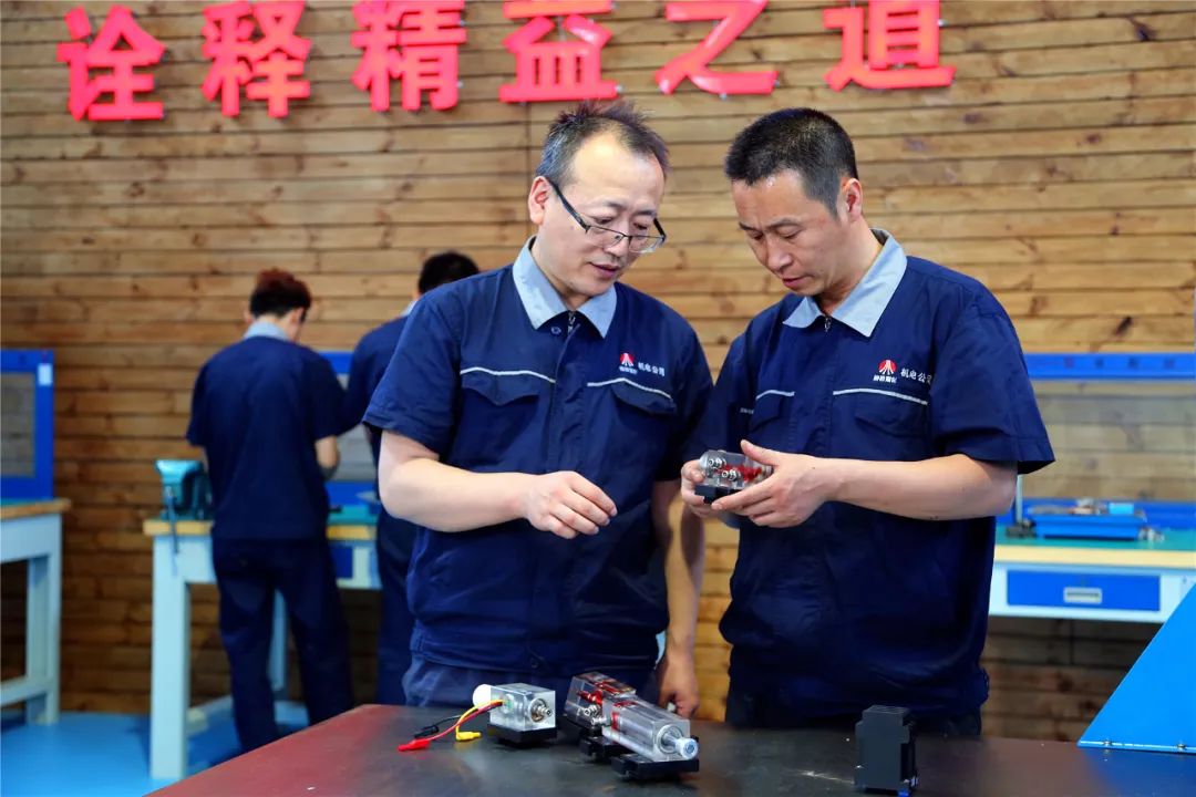 “大家參照圖紙要求,將液壓閥件進行連接,只有連接正確才能正常流通工作?!弊哌M技能大師工作室液壓實踐區(qū),全國煤炭行業(yè)技能大師、陜西省勞動模范李海清正在向兩名新工講解液壓系統(tǒng)工作原理及相關知識。