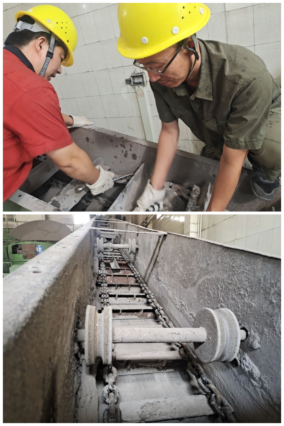 “先將輪碾機(jī)內(nèi)的物料壓制完成,然后兵分兩路,焦?jié)龓ьI(lǐng)人員將消解倉(cāng)物料人工退回至爐渣倉(cāng);黨志全你們五個(gè)更換鏈條?!彪S著郭黨峰的指揮,火熱的生產(chǎn)現(xiàn)場(chǎng)變?yōu)榫o張的搶險(xiǎn)現(xiàn)場(chǎng)。