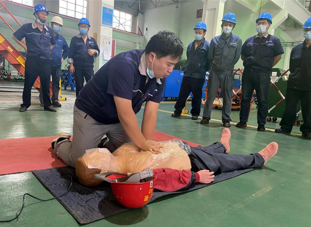 為進(jìn)一步推動公司安全管理工作,強(qiáng)化職工安全意識,提高自救自護(hù)能力。該公司暢通“綠色通道”,主要針對職工因誤觸電而引發(fā)休克、心臟驟停等現(xiàn)象,在電修車間展開“心肺復(fù)蘇”急救演練。