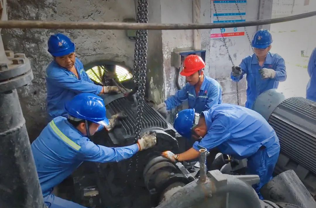 “本次搶修的主要工作涵蓋拆除地腳、對輪、電機電纜、電機吊離、更換軸承、備用電機回裝、校正等十余道工序,要在一天之內(nèi)連續(xù)完成所有項目,對檢修人員的技術水平、體能以及協(xié)調(diào)配合能力都是極大的考驗?!痹摴緳z修車間職工葉培元介紹說。