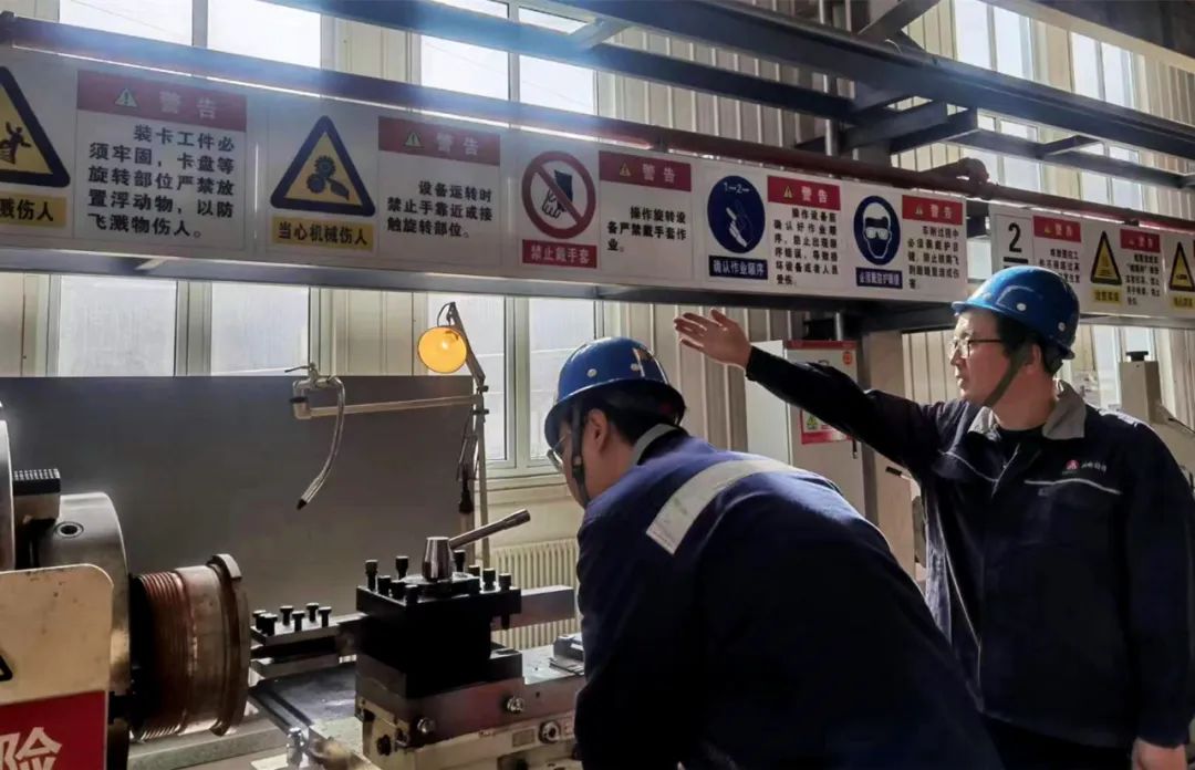 “工作場所張貼標識牌,警示我們的同時也督促我們養(yǎng)成良好的安全行為習慣,工作起來既舒心又安心?!?車工彭柏霖每次在車削前都要按規(guī)程佩戴上護目鏡。