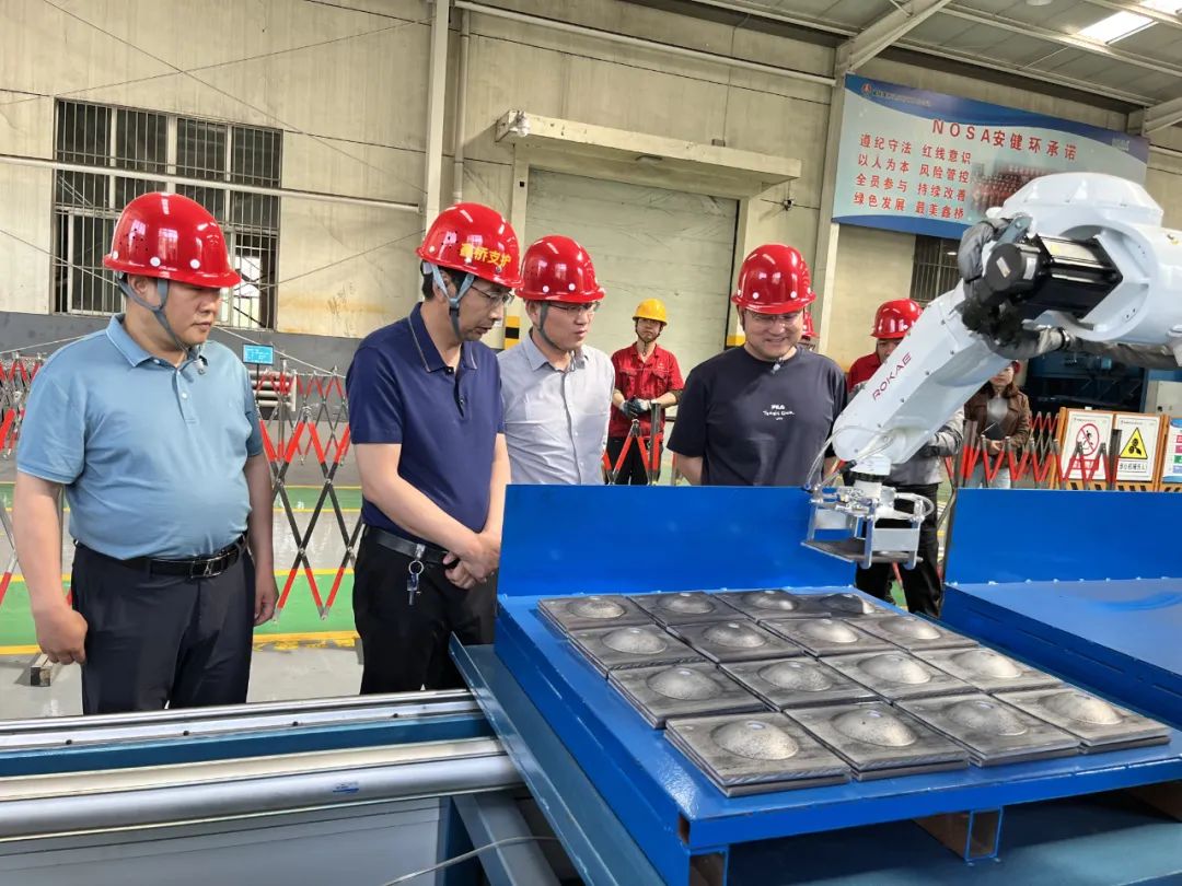 在支護(hù)總廠,劉建偉實(shí)地察看了全自動(dòng)托盤生產(chǎn)線,詳細(xì)了解了該生產(chǎn)線工作流程、產(chǎn)能、質(zhì)量管控及人員調(diào)整等情況,對(duì)該生產(chǎn)線能夠?qū)崿F(xiàn)原材料多摞上料、嚙合齒條精準(zhǔn)傳送、機(jī)器人自動(dòng)碼垛等全過(guò)程自動(dòng)化生產(chǎn)給予了肯定。他表示,全自動(dòng)托盤生產(chǎn)線的引進(jìn),為“智慧鑫橋”注入新血液、新動(dòng)力,同時(shí)達(dá)到了減人提效的目的,增強(qiáng)了競(jìng)爭(zhēng)力。