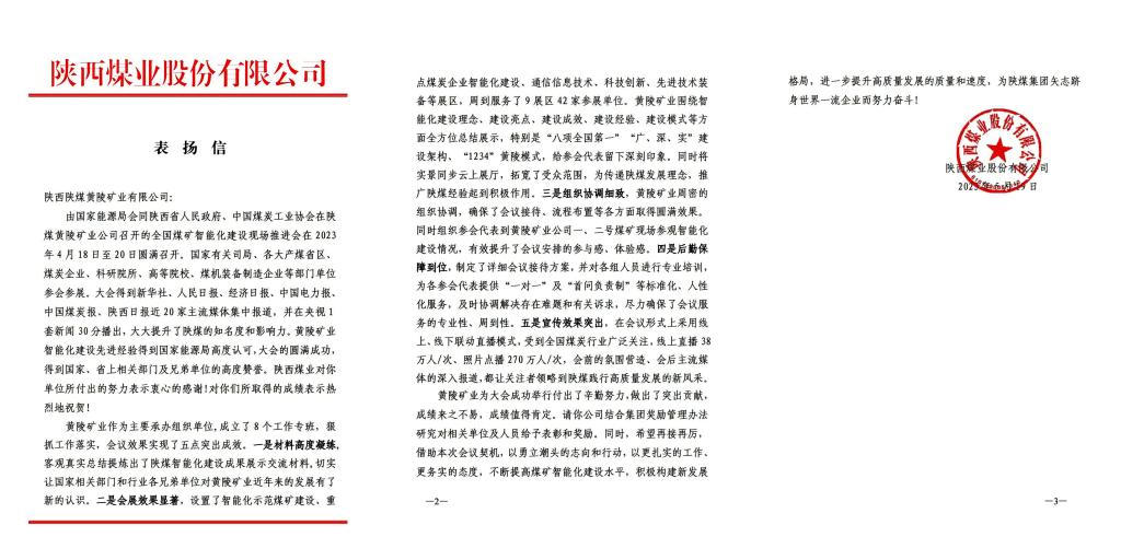 表揚(yáng)信中寫道:“由國家能源局會同陜西省人民政府、中國煤炭工業(yè)協(xié)會在陜煤黃陵礦業(yè)公司召開的全國煤礦智能化建設(shè)現(xiàn)場推進(jìn)會,得到新華社、人民日報、經(jīng)濟(jì)日報、中國電力報、中國煤炭報、陜西日報近20家主流媒體集中報道,并在央視1套新聞30分播出,大幅提升了陜煤的知名度和影響力。黃陵礦業(yè)智能化建設(shè)先進(jìn)經(jīng)驗(yàn)得到國家能源局高度認(rèn)可,大會的圓滿成功,得到國家、省上相關(guān)部門及兄弟單位的高度贊譽(yù)?!?/p>