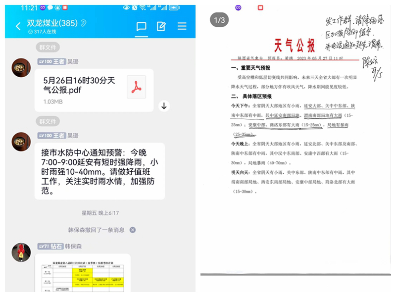“最近三天,黃陵地區(qū)降雨量持續(xù),雨季三防工作人員做好值守工作,保持通訊暢通?!?月27日,雙龍煤業(yè)調(diào)度室調(diào)度員吳璐每天按時通過工作群進行氣象信息通報。
