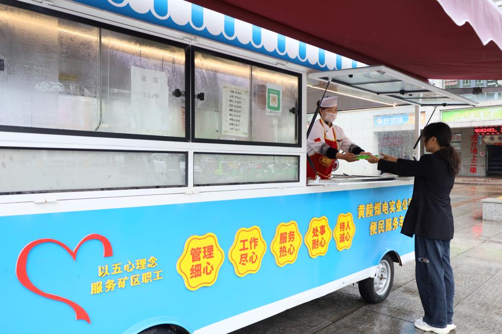 在礦區(qū)中心廣場(chǎng),一輛藍(lán)色的流動(dòng)餐車成為了礦區(qū)一道亮麗的風(fēng)景線。餐車上發(fā)糕、包子、炒菜等熱騰騰的食物,更是流動(dòng)著滿滿的愛(ài)。