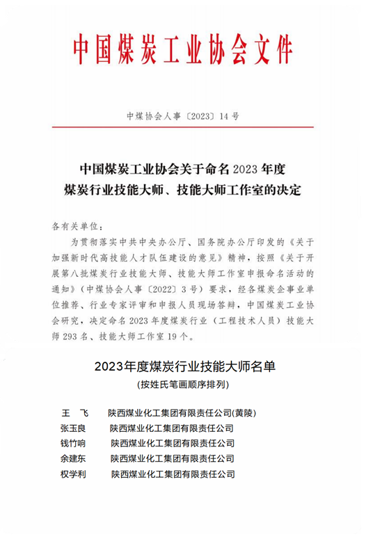 近日,由中國煤炭工業(yè)協(xié)會評選的2023年度“煤炭行業(yè)技能大師”結(jié)果正式揭曉,公司所屬一號煤礦王飛、張玉良、錢竹響,瑞能煤業(yè)余建東,機電公司權(quán)學(xué)利5名同志榮獲“第八批煤炭行業(yè)(工程技術(shù)人員)技能大師”稱號。截至目前,黃陵礦業(yè)公司已有21名煤炭行業(yè)技能大師。