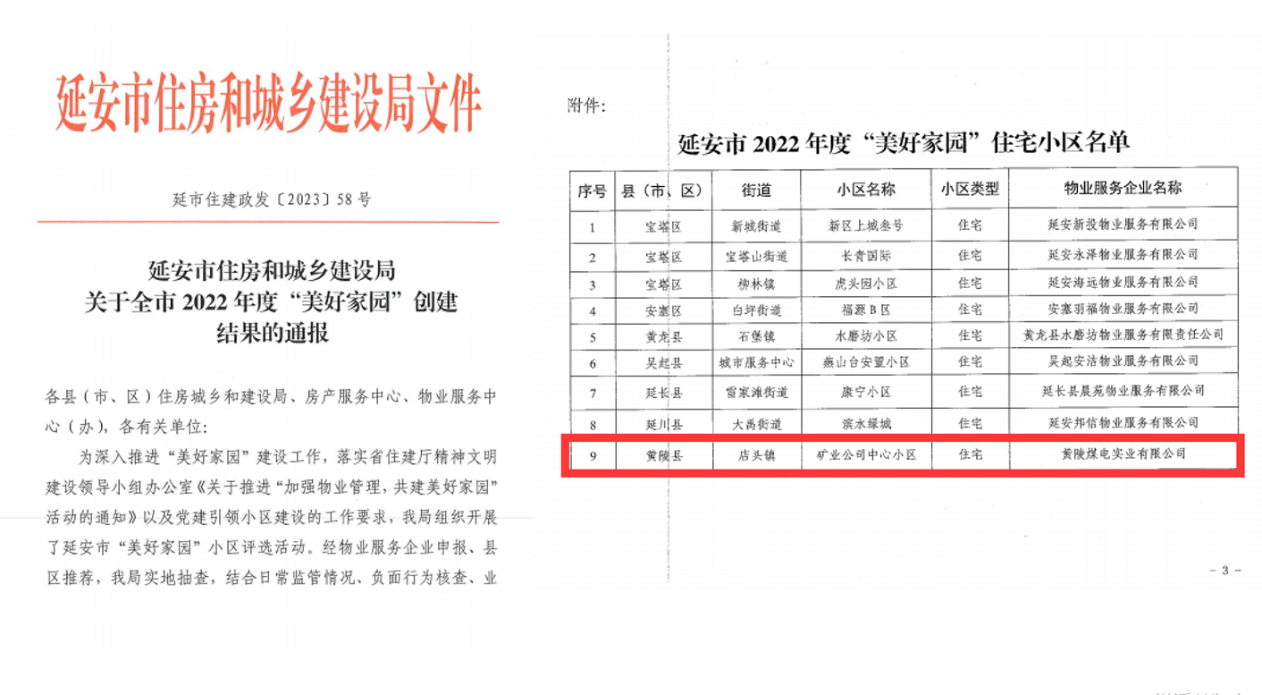 近日,從延安市住房和城鄉(xiāng)建設(shè)局傳來喜訊,黃陵礦業(yè)中心小區(qū)摘得延安市2022年度“美好家園”榮譽(yù)稱號(hào)。