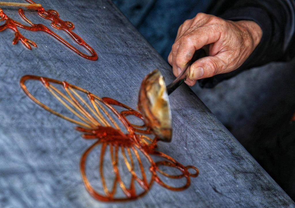 隨著轉(zhuǎn)盤指針停止轉(zhuǎn)動(dòng),我的回憶也戛然而止。轉(zhuǎn)到的是一只傳統(tǒng)的鳥,糖畫大爺見我有些興致,也就沒有直接取下現(xiàn)成品遞給我,而是伸出微微發(fā)抖的手,拿出十足的風(fēng)范,肆意而熟練地描畫著。糖漿落下瞬間凝固,一時(shí)間我也目不轉(zhuǎn)睛,只覺著像是博物館展出的剪紙或者版畫,帶著濃濃的煙火氣息。