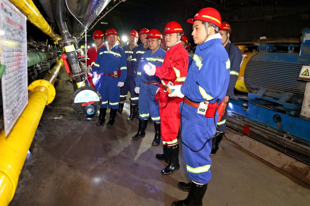 王鵬飛實地察看了1010智能化綜采工作面通風(fēng)系統(tǒng)、瓦斯抽采系統(tǒng)、安全監(jiān)測監(jiān)控系統(tǒng)、垛式支架搬運機器人的運行情況和工作面標(biāo)準(zhǔn)化動態(tài)管理達標(biāo)情況,聽取了一號煤礦安全生產(chǎn)、災(zāi)害治理、系統(tǒng)優(yōu)化、“110工法”等方面工作匯報,對一號煤礦無煤柱沿空留巷開采工作給予充分肯定。