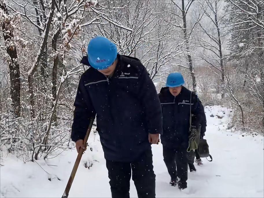 風(fēng)雪山林中,幾個(gè)人深一腳淺一腳地艱難前行著,崔濤手拿鐵鍬踏著這條讓他既熟悉又陌生的山路,每走一步都小心翼翼,高新宇手提著無(wú)人機(jī)背包跟著他的腳步,年紀(jì)最小的權(quán)旭寶身上則背著一把二十余斤重的油鋸,時(shí)刻準(zhǔn)備清理線路下的林木。濕滑的山路不時(shí)讓人滑倒,摔倒后他們又起身拍拍身上的雪繼續(xù)前行。