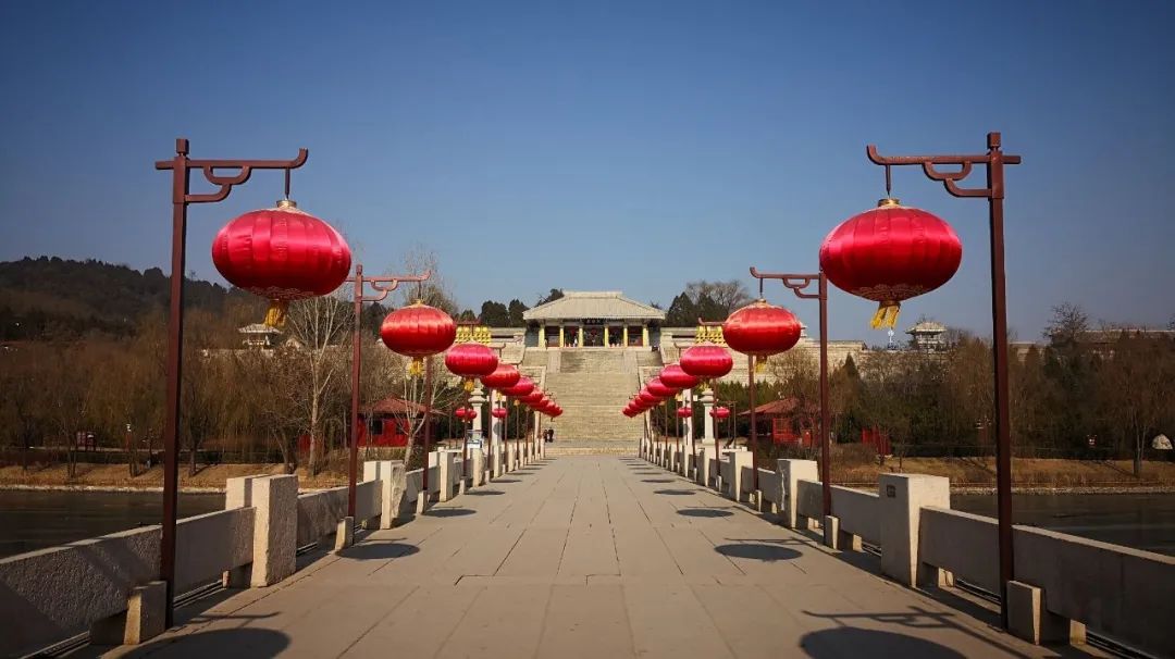 廣場的北邊是一汪來自沮河的印池,水面上??恐e置的小船,許是天冷的緣故,偶爾有鳥從天空飛過,遠(yuǎn)處的建筑若隱若現(xiàn),遠(yuǎn)觀猶如一幅畫,大紅的燈籠高高挑起,軒轅橋上人來人往,人們順階而上,通向廟院的臺階九十五級,導(dǎo)游介紹說,這道叫龍威道九十五級臺階,寓意黃帝九五之尊的崇高地位。